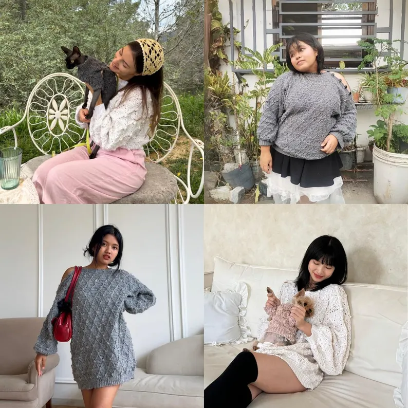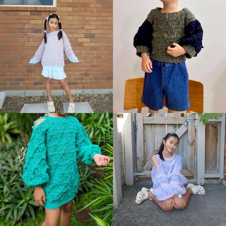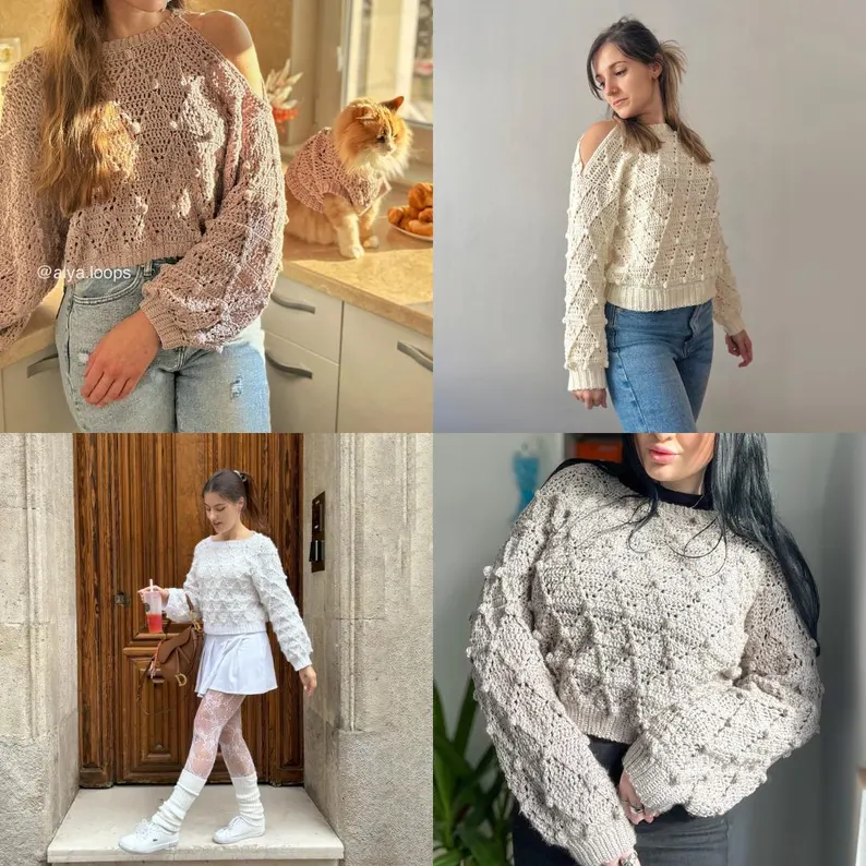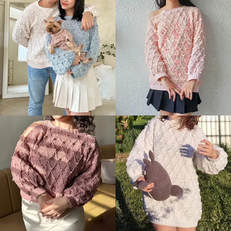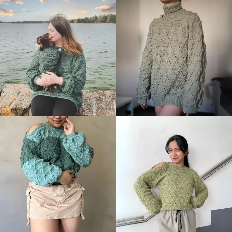 Designed as a unisex, made-to-measure pattern, the Winter sweater features a beautiful diamond texture, a unique openable button shoulder, and a neck warmer that allows for multiple styling options. Despite its name, this sweater can be worn all year round and even includes a furbaby (pet) version so everyone can match!